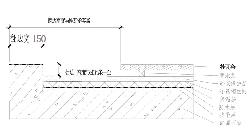 水泥屋面:混凝土屋面浇注洞口时与反梁一起浇注 ,反梁高度与洞口四周的挂瓦条持平,反梁的宽度为12-15公分;洞口外表面要干燥、干净、平整,在屋面做防水时,要与反梁一起刷防水或将SBS粘之反梁上方(如图)