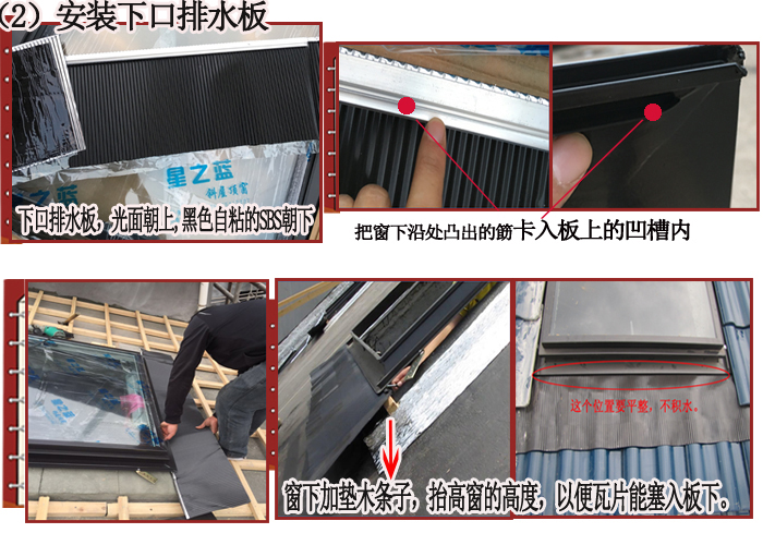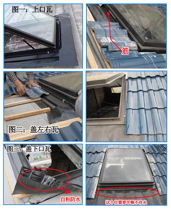 图一:盖上口瓦时盖住上口排水板,可以留出少许排水空间,最多可顶到窗的筋处,但不能影响天窗开启。
