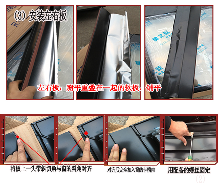 (3)安装左右板:要先将背面折在一起的软板掰开、铺平后再装,板上带有密封条是与窗靠一起的,板要完全卡入窗内,不能有缝隙。卡好后用星之蓝配备的铝合金扣子固定,一般左右各两个。